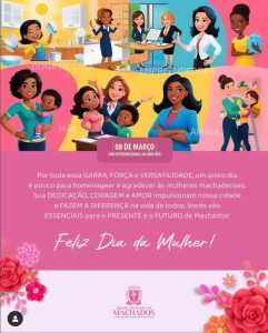 A Câmara de Vereadores de Machados, por meio dos seus sete vereadores e DUAS VEREADORAS que orgulhosamente representam a versatilidade e a grandeza feminina, deseja mais do que um dia de homenagens, deseja a todas uma vida inteira de respeito, igualdade e reconhecimento. Vocês são essenciais para nossa sociedade!